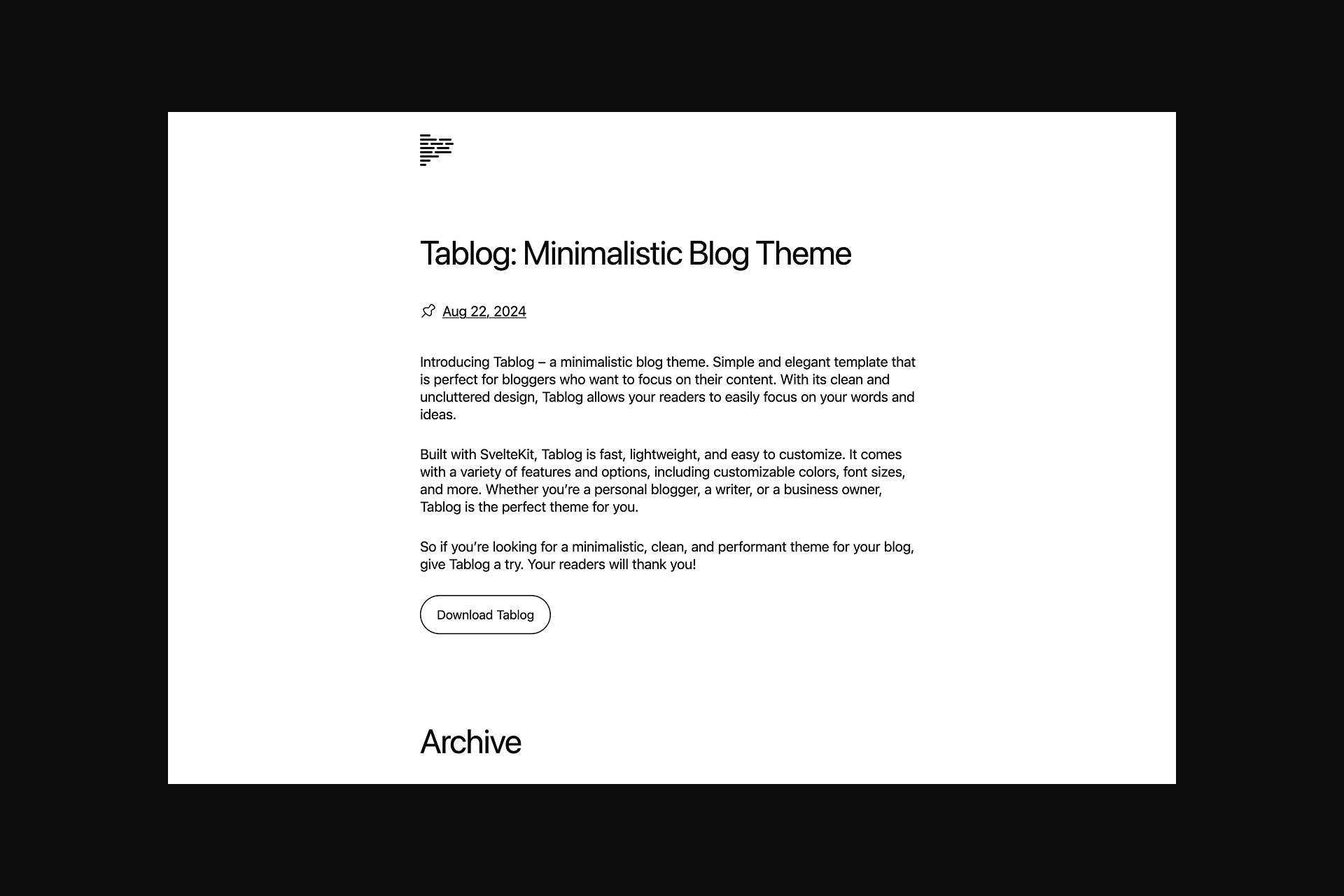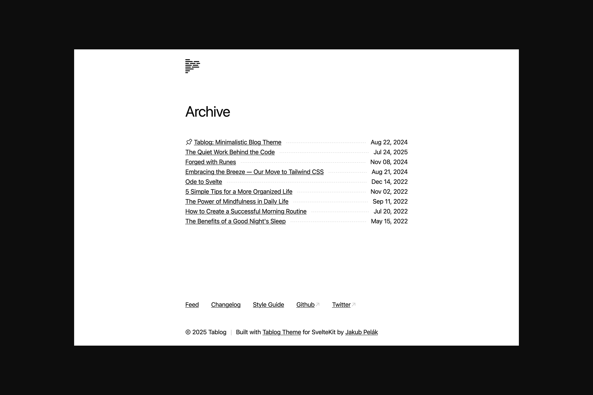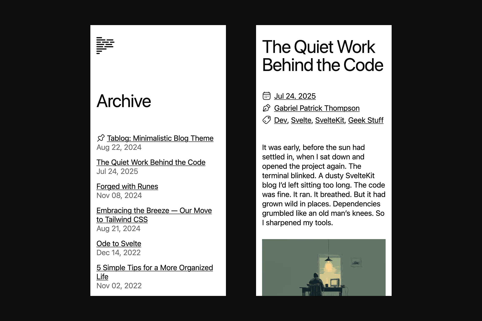 As someone who enjoys building and theming with SvelteKit, I wanted to create a modern blog starter that’s both approachable and flexible. My motivation for this project came from my ongoing work on Tablo themes at Tablo.Supply—a collection of themes for Kirby CMS. I thought it would be a great exercise to port the Tablog theme to Svelte, bringing the same clean design and content-first approach to a new stack.